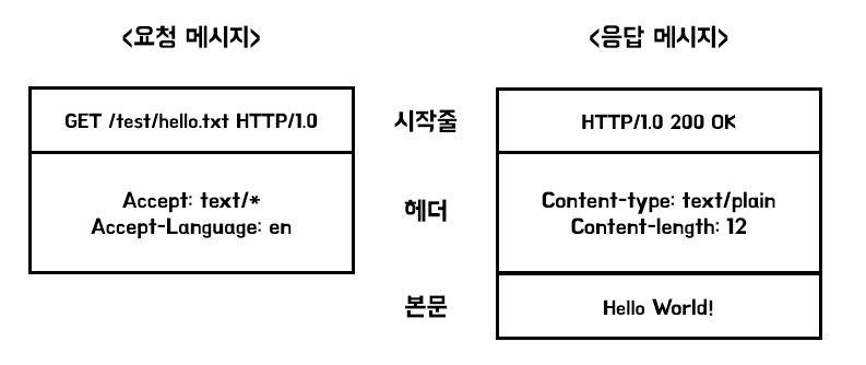 시작줄: 메시지의 첫 줄. 요청 메시지는 무엇을 해야하는지(메소드), 응답 메시지는 어떻게 됐는지(상태코드).