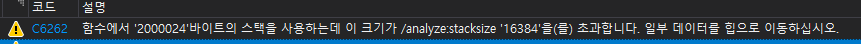 - 이 경고는 미리 설정된 임계값을 초과하는 스택 사용량이 함수에서 검색되었음을 나타냅니다. ~~ 문제를 해결하려면 일부 데이터를 힙 또는 다른 동적메모리로 이동할 수 있습니다.