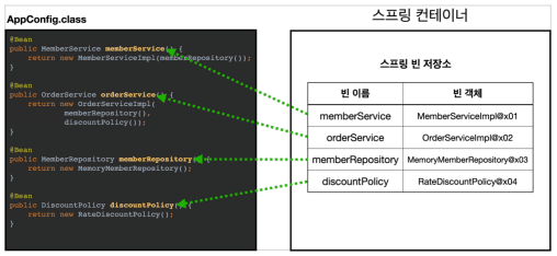 - private 생성자가 아닌 일반적인 클래스라도 스프링 컨테이너에게 제어권을 위임함으로써 싱글톤 방식으로 사용할 수 있다. (= 싱글톤 패턴이 적용되지 않은 클래스도 싱글톤 클래스로 사용할 수 있게 해준다)