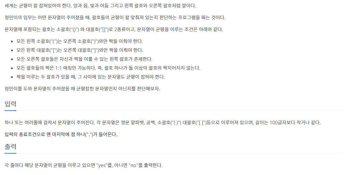 1. 문자열을 하나씩 반복문 돌면서 '(' 나 '[' 가 입력되면 스택에 push