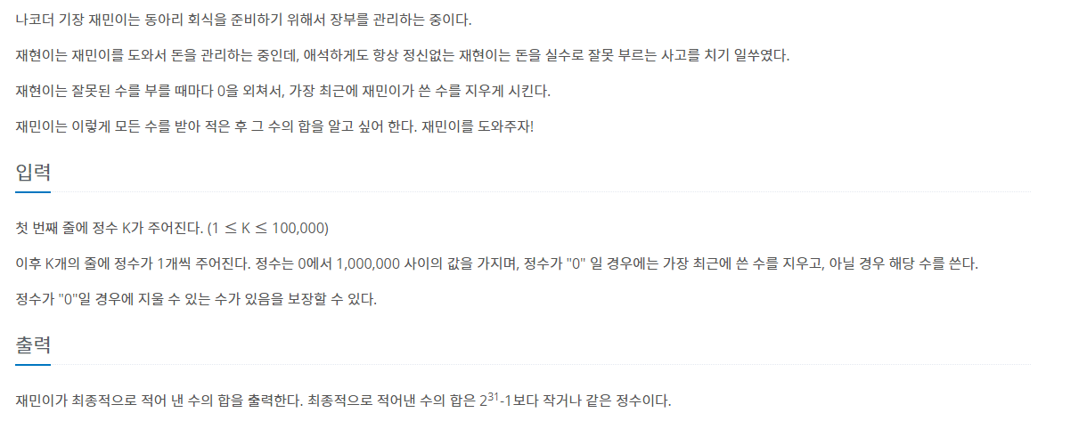 그러므로, "0"이 들어오면 앞에 무엇이든지 지울 숫자가 하나 이상은 있다는 이야기이다.