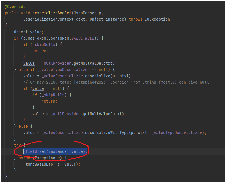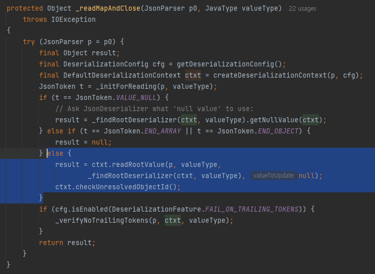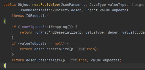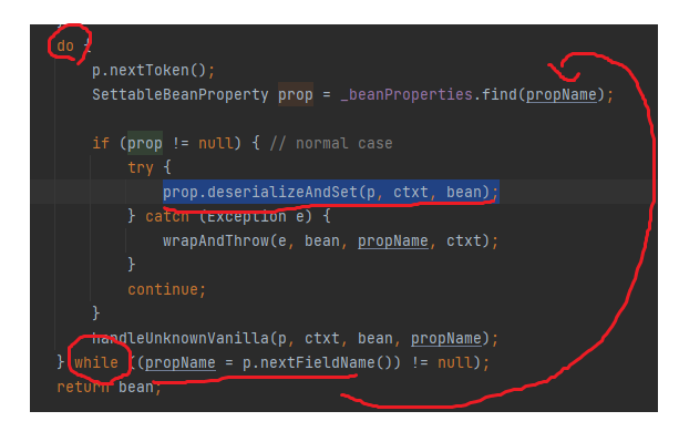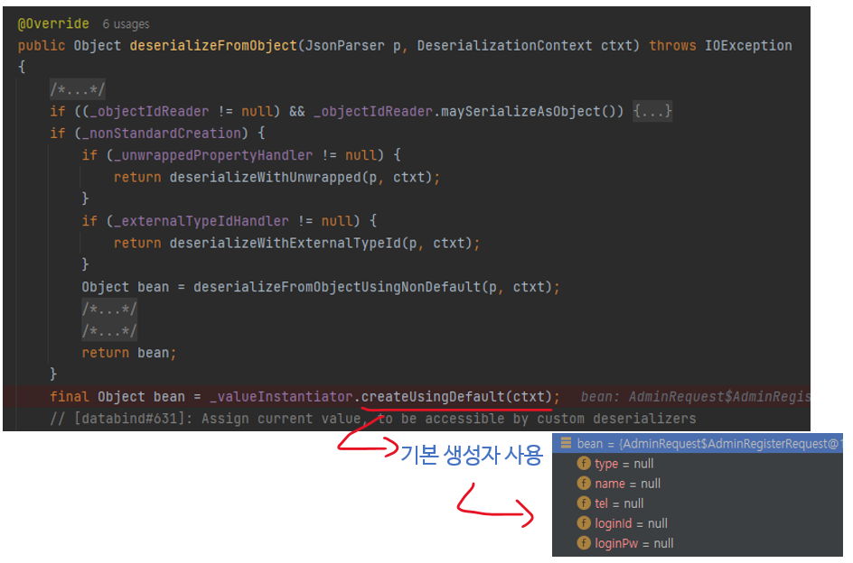BeanDeserializer 내부에서는 JSON을 파싱한 다음 키값에 대해 반복문을 돌면서 해당하는 키값과 맞는 프로퍼티를 찾고, 해당 프로퍼티에 값을 채워넣는 방식으로 진행된다.
